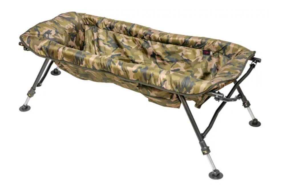 Kolíska na ryby, ktorú možno otvoriť mihnutím oka, s odolným kovovým rámom a pevným, ľahko schnúcim materiálom. Vďaka teleskopickým nohám a výklopným pätkám ju možno stabilne postaviť aj na nerovnom teréne.